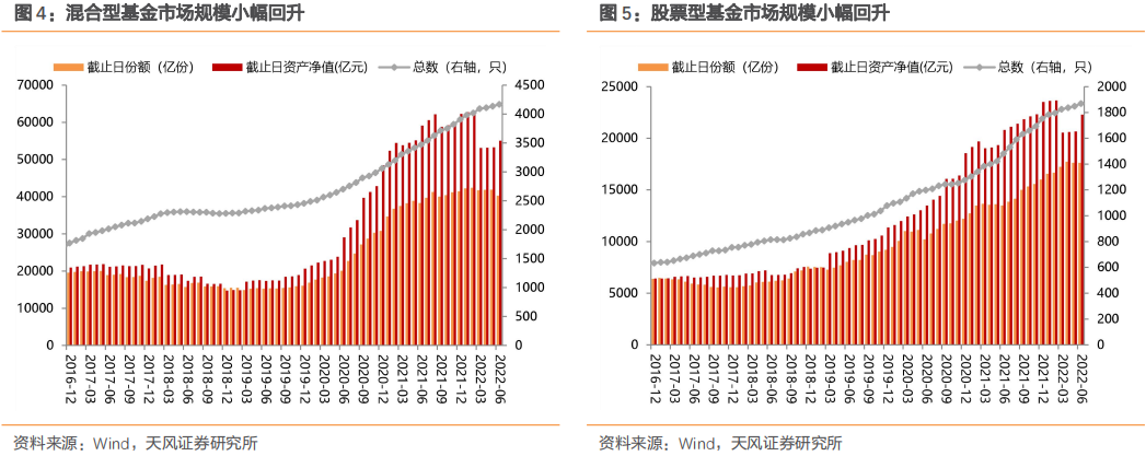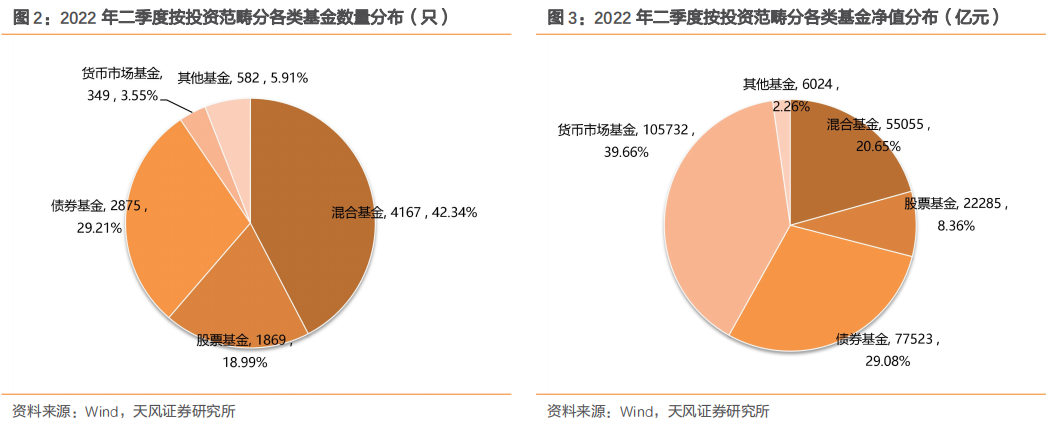 从 Wind 公布的数据来看,2022 年二季度末,混合型基金资产净值约 5.51 万亿元,较 2022年一季度末上升3.69%;股票型基金资产净值约 2.23万亿元,较2022年一季度末上升 8.41%;货币型基金资产净值约为 10.57 万亿元,较 2022 年一季度末上升 4.73%。