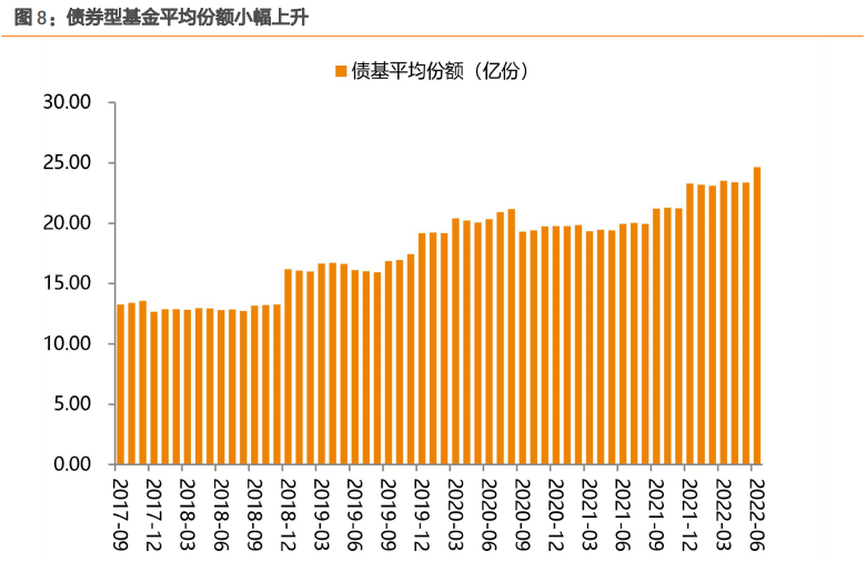 债券型基金方面,2022年二季度债基总体份额7.09万亿份,较2022年一季度末上升9.59%;平均份额24.65亿份,较2022年一季度末上升4.87%;债券型基金资产净值约为7.75万亿元,较2022年一季度末增加9.88%。