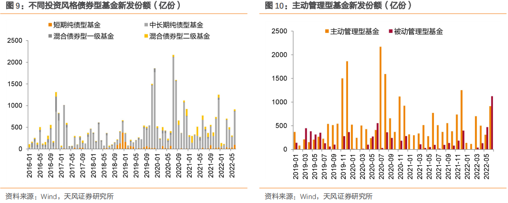 从债券型基金投资风格来看,2022年二季度,主动管理型基金(短期纯债型基金、中长期纯债型基金、一级债基、二级债券)的新发份额为1725.23亿份,较2022年一季度有明显增多,增多了770.12亿份。被动管理型基金(被动指数型债基)的新发份额为1729.14亿份,较2022年一季度明显增多,增多了1689.44亿份。
