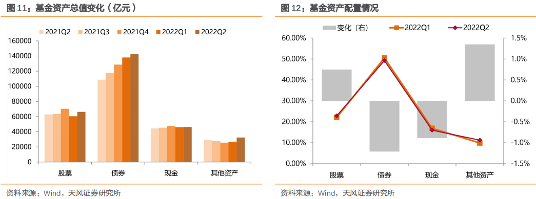 我们利用Wind数据对基金的资产配置进行具体分析。截至2022年二季度末,各类基金资产总值小幅增加,较2022年一季度末增加5.92%;其中,股票的资产市值增加9.52%,债券的资产市值增加3.38%,现金的资产市值增加0.34%。从资产配置的比例看,其他资产、股票的占比上行,债券、现金的占比下行;2022年二季度末股票、债券、现金、其他资产占比分别为22.84%、49.28%、15.98%、11.19%。