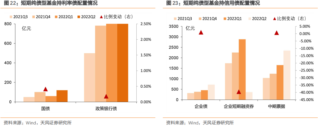 从利率债具体配置情况来看,2022年二季度短期纯债型基金持有的国债和政策性银行债的市值分别占债券投资市值的1.32%、12.67%。与2022年一季度相比,短期纯债型基金对主要利率债的配置比例均有增加。