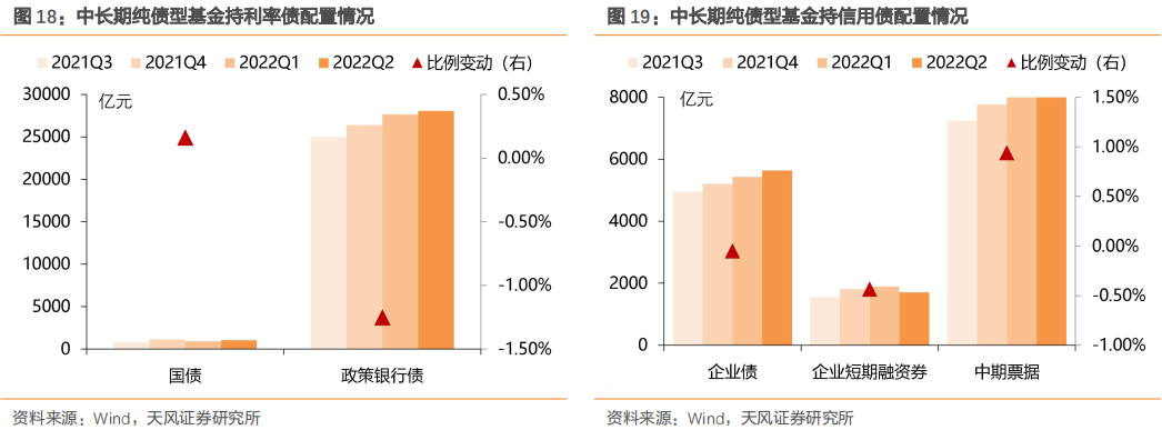 从利率债具体配置情况来看,2022年二季度中长期纯债型基金持有的国债和政策性银行债的市值分别占债券投资市值的1.72%、46.09%。与2022年一季度相比,中长期纯债型基金对国债的配置比例有增加,对政策性银行债的配置比例有减少。