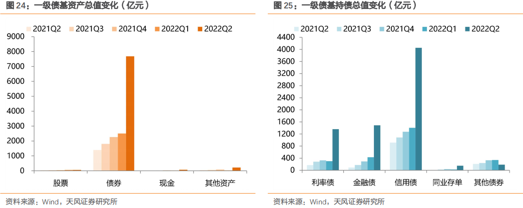 从债券配置比例看,与2022年一季度比,一级债基增加了对利率债、金融债、信用债、同业存单的配置比例,减少了对其他债券的配置比例。