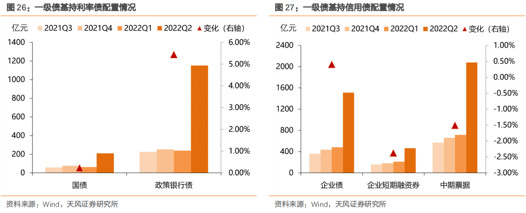 从利率债具体配置情况来看,2022年二季度末,一级债基持有的国债和政策性银行债的市值分别占债券投资市值的2.72%、14.97%。与2022年一季度相比,一级债基对主要利率债的配置比例均有所增加。