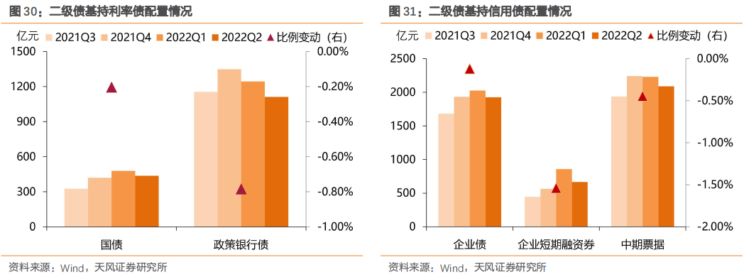 从利率债具体配置情况来看,2022年二季度末,二级债基持有的国债和政策银行债的市值分别占债券投资市值的4.39%、11.17%。与2022年一季度相比,二级债基减少了对国债、政策银行债的配置比例。