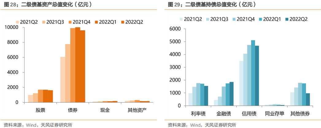 从持债情况看,截至2022年二季度末,二级债基持有的券种总值约为9958亿元,金融债上升了6.43%,利率债、信用债、同业存单、其他债券市值分别下降了10.03%、8.42%、29.37%、44.22%。