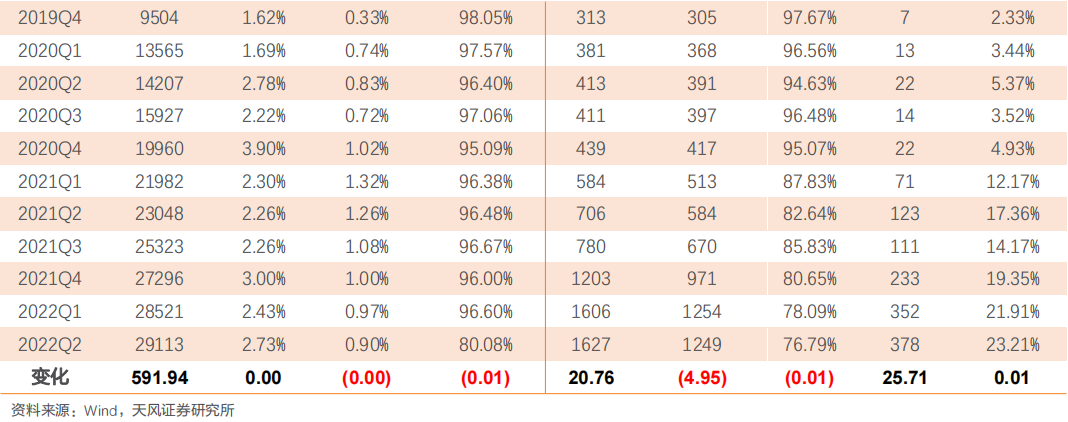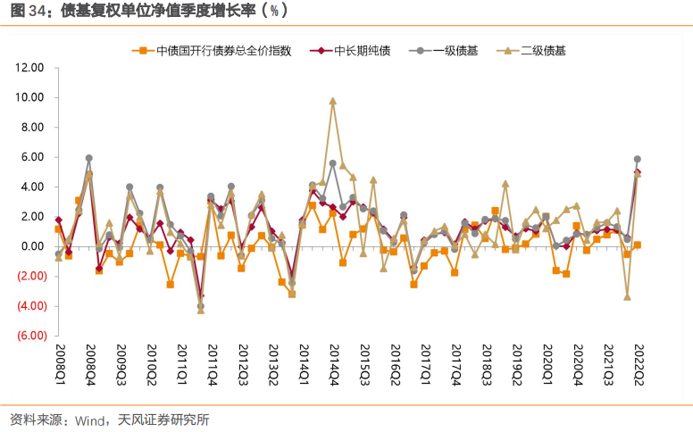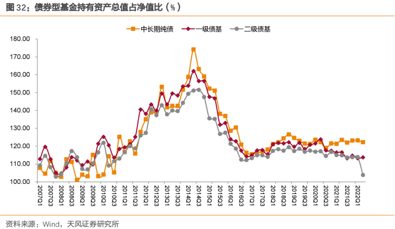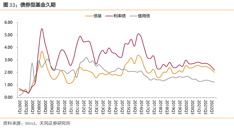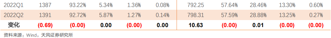 我们用债券型基金的重仓券来近似计算久期。截至2022年二季度末,债券型基金的久期为2.01,相比2022年一季度下行了0.22,其中,利率债(国债、地方政府债、政策银行债)加权久期下降0.28至2.19,信用债(短融、中票、公司债、企业债)加权久期下降0.06至1.23。