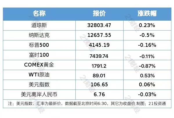 COMEX 12月黄金期货结算价收跌0.87%,报1791.2美元/盎司;WTI 9月原油期货收涨0.53%,报89.01美元/桶。