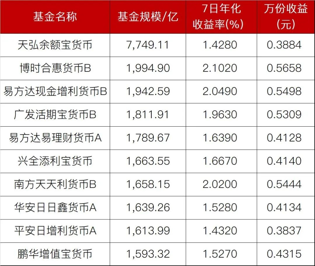 我顺便看了一下货币基金,真的是“够低”。下面是规模前十的货币基金,我们可以看到7日年化收益已经有7只低于2%,超过2%的三只货币基金,还是属于货币基金B类。这个B类可以理解为门槛较高的货币基金,一般500万起,所以这B类货币基金稍微高一点。
