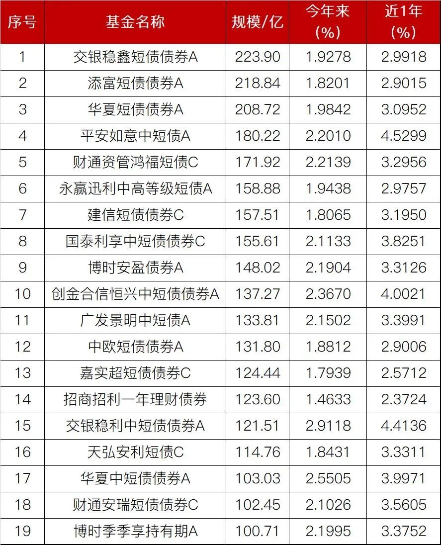 在同业存单基金出现之前,短债、中短债基金就是货币基金的增强版。这类基金风险稍高于货币基金,收益也稍高于货币基金。根据choice分类,短期纯债型基金有659只,我们就只把规模超过100亿的列出来,共计19只: