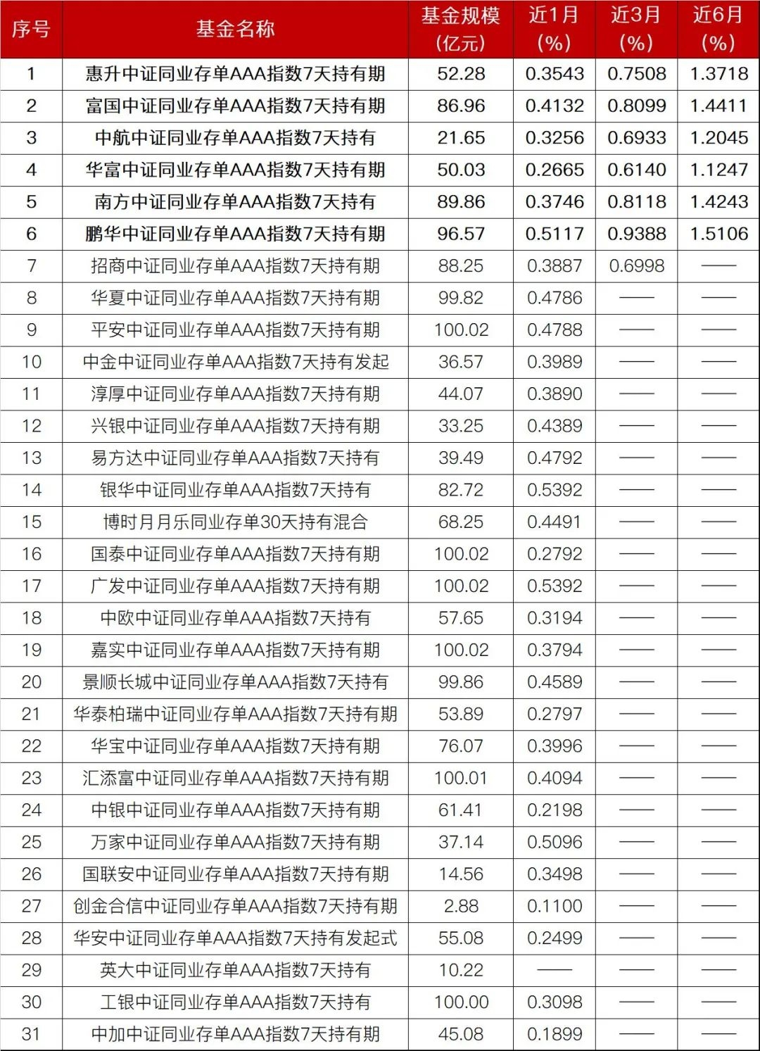 目前市面上已经有31只同业存单基金,最开始成立的一批已经跑了大半年。我们看最好的收益,是半年1.5%,如果按照这个计算的话,一年的收益率在3%左右。也比货币基金稍高一些了。流动性上,持有7天才可以赎回,流动性稍逊于货币基金。这类基金规模已经突破2000亿,真可谓炙手可热。