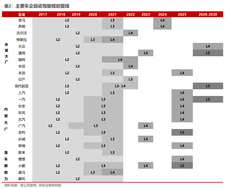 车企积极布局智能驾驶。2021年一汽、长安、东风、北汽、吉利、长城、奇瑞、小鹏实现L3级别量产,国外特斯拉、本田实现L3级别量产。高级别的L4 则在成本、技术和路权等方面仍存在难点,从内资来看,国内自主车企普遍规划在2021-2025年推出。