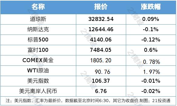 1、美国三大股指收盘涨跌不一,道指涨0.09%报32832.54点,标普500指数跌0.12%报4140.06点,纳指跌0.1%报12644.46点。中概股涨跌互现,中阳金融涨102.66%,尚乘数科跌43%。