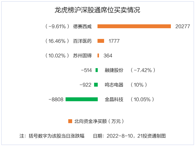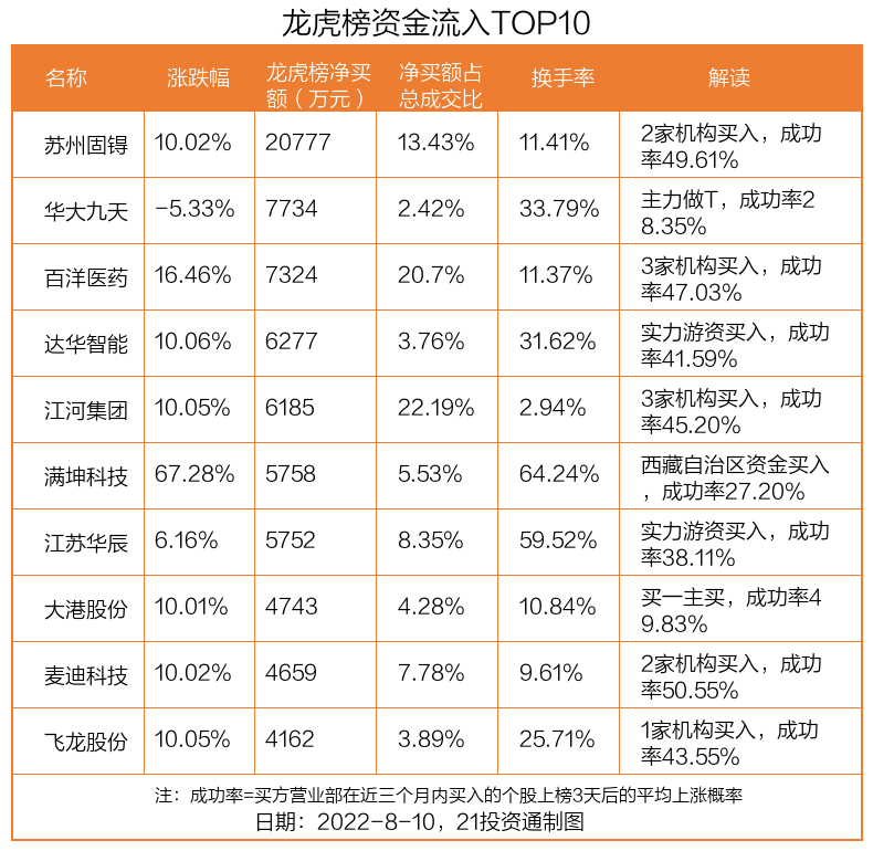 8月10日,上证指数下跌0.54%,深证成指下跌0.87%,创业板指下跌1.34%。盘后龙虎榜数据显示,共有49只个股因当日异动登上龙虎榜,资金净流入最多的是苏州固锝(002079.SZ),达2.08亿元。