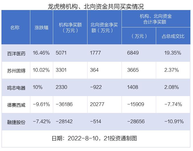 值得注意的是,机构和北向资金共同净买入了百洋医药、苏州固锝;共同净卖出了融捷股份;在德赛西威、鸣志电器上出现分歧。