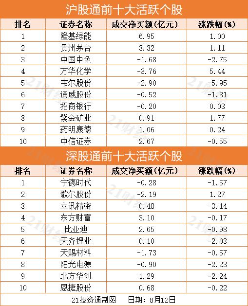 十大活跃个股方面,隆基绿能、贵州茅台、东方财富分别获净买入6.95亿元、3.32亿元、3.1亿元。万华化学净卖出额居首,金额为3.76亿元。