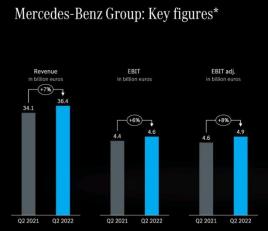 早在7月末的二季度财务数据发布会上,康林松的演示文稿扉页便是三个亮眼的数字:该季度营收同比增长7%至364亿欧元;息税前利润同比增长6%至46亿欧元;调整后息税前利润同比增长8%至49亿欧元。再加上每股5欧、相当于8.2%回报率的派息,奔驰似乎正在蒸蒸日上。