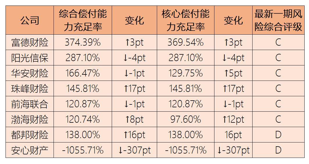 具体来看,今年二季度共8家险企偿付能力不达标,分别是富德财险、阳光信保、华安财险、珠峰财险、前海联合、渤海财险、都邦财险和安心财险。前四家最新一期风险评级由B类直接降为C类,都邦财险由B类降为D类。