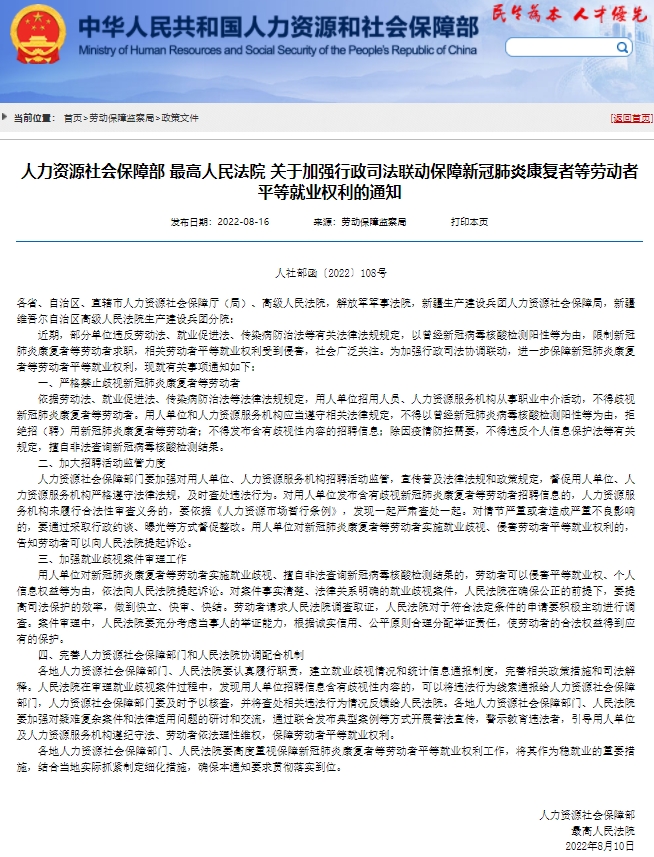 据人社部网站8月16日消息,人力资源和社会保障部、最高人民法院发布《关于加强行政司法联动保障新冠肺炎康复者等劳动者平等就业权利的通知》,全文如下: