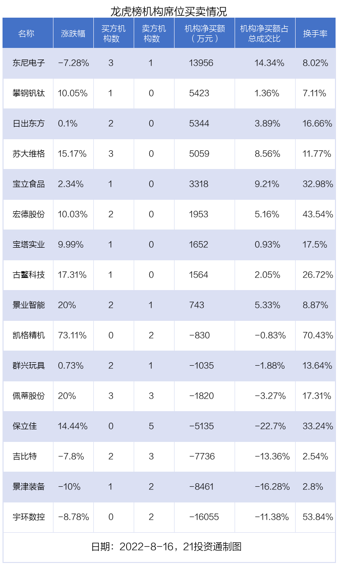 据21投资通(微信号ID:touzit21)智能监测,16只个股龙虎榜出现了机构的身影,北向资金参与龙虎榜中的个股共涉及3只。