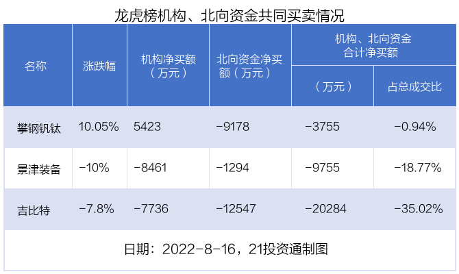 值得注意的是,机构和北向资金共同净卖出了景津装备、吉比特等2股;在攀钢钒钛上出现分歧,机构净买入攀钢钒钛5422.54万元,北向资金净卖出9177.64万元。