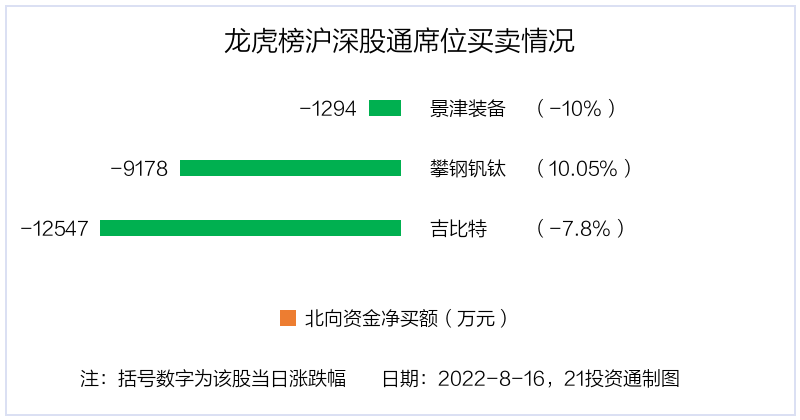 8月16日,北向资金参与龙虎榜中的个股共有3只,合计净卖出2.3亿元。其中沪股通净卖出2 股,合计净卖出1.38亿元;深股通净卖出1 股,净卖出9177.64万元。