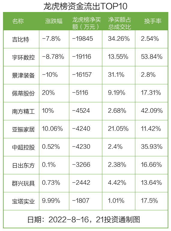 龙虎榜中资金净流出最多的是吉比特(603444.SH),被净卖出为1.98亿元,占总成交金额的34.26%。吉比特收盘下跌7.8%,换手率为2.54%。