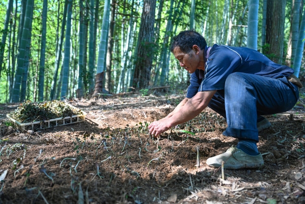 ↑2022年6月23日,村民沈大表在下党村的大山里种植金线莲。沈大表和他的儿子种植金线莲20多亩,预计今年收入超过30万元。