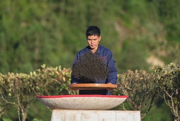 ↑2022年6月23日,村民周建伟在下党村的茶厂制茶。茶是下党村支柱产业之一,近300户村民种植茶叶。