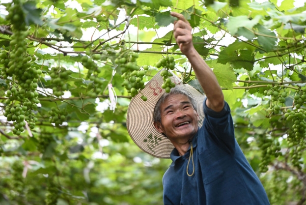 ↑2022年6月23日,村民吴通兴在下党村康庄葡萄园劳作。吴通兴在葡萄园一天收入200元。