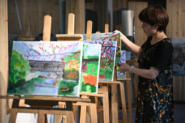 ↑2022年6月23日,吴祥芳在下党村下党画苑摆放画作。吴祥芳从外地来到下党村创业,她的作品主要描绘下党村的发展变化,经营的画苑年营收超过10万元。