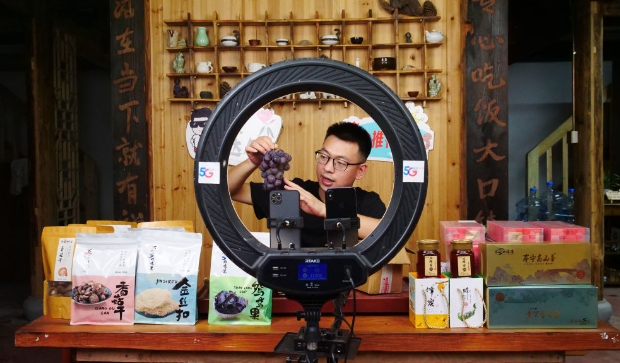 ↑2021年8月17日,返乡创业青年陈上友在下党村78号直播间向粉丝介绍当地的农产品。