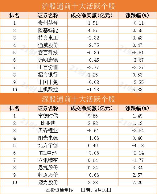 十大活跃个股方面,宁德时代(300750.SZ)、北方华创(002371.SZ)、隆基绿能(601012.SH) 获净买入居前,金额分别为9.86亿元、6.40亿元、4.87亿元。值得注意的是,北向资金已连续两日大幅加仓宁德时代,合计净买入17.1亿元。