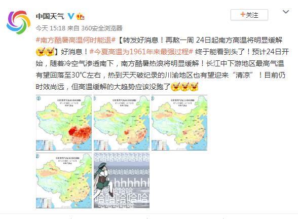 据中国气象局公共气象服务中心官方微博“中国天气”消息:再熬一周,8月24日起南方高温将明显缓解。