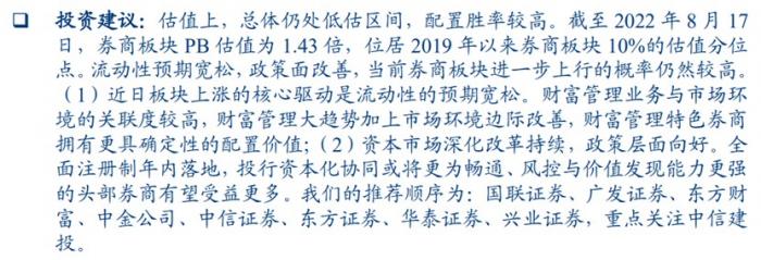 华创证券称,估值上,(券商板块)总体仍处低估区间,配置胜率较高。截至2022年8月17日,券商板块PB估值为1.43倍,位居2019年以来券商板块10%的估值分位点。流动性预期宽松,政策面改善,当前券商板块进一步上行的概率仍然较高。(1)近日板块上涨的核心驱动是流动性的预期宽松。财富管理业务与市场环境的关联度较高,财富管理大趋势加上市场环境边际改善,财富管理特色券商拥有更具确定性的配置价值;(2)资本市场深化改革持续,政策层面向好。全面注册制年内落地,投行资本化协同或将更为畅通、风控与价值发现能力更强的头部券商有望受益更多。
