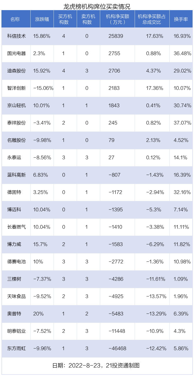 其中,机构净买入金额最多的是科信技术(300565.SZ),当日收盘上涨15.86%,换手率为16.93%。前五大买卖营业部中有4家机构,为合计净买入2.58亿元,占总成交金额的17.63%。