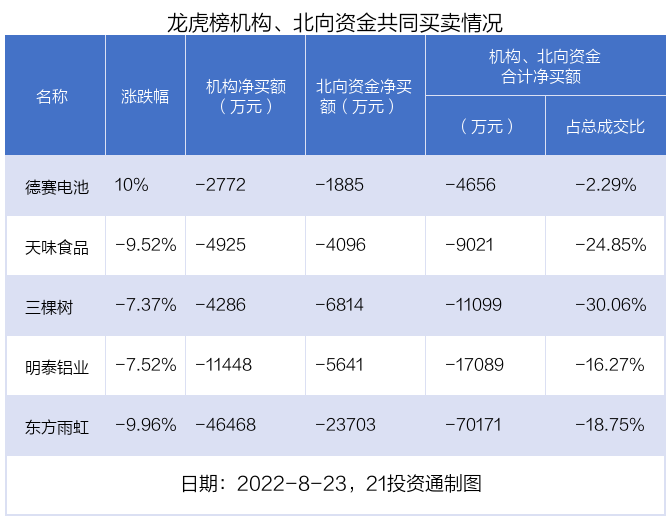 值得注意的是,机构和北向资金共同净卖出了德赛电池、天味食品、明泰铝业、三棵树、东方雨虹等5股。