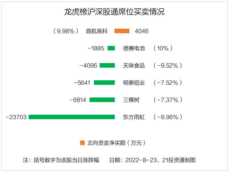 8月23日,北向资金参与龙虎榜中的个股共有6只,合计净卖出3.81亿元。其中沪股通净卖出3 股,合计净卖出1.65亿元;深股通净买入1 股,净卖出2 股,合计净卖出2.15亿元。