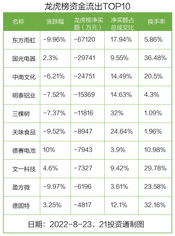 而龙虎榜中资金净流出最多的是东方雨虹(002271.SZ),被净卖出为6.71亿元,占总成交金额的17.94%。东方雨虹收盘下跌9.96%,换手率为5.86%。