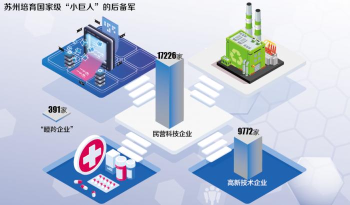 这也是苏州培育专精特新企业的主要方向。苏州目前已形成以新一代信息技术、高端装备、新材料、新能源、生物医药等行业为代表的新兴产业集群,培育产生了“百千万”(391家“瞪羚企业”、9772家高新技术企业、17226家民营科技企业)的科创企业群体,这些企业不少是细分领域头部企业,为苏州培育国家级“小巨人”企业提供了充足的“后备军”。