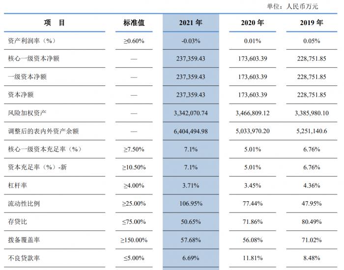 沈阳农商行年报显示,截至2021年末,其总资产为649.41亿元,核心一级资本充足率为7.1%,不良率为6.69%、拨备覆盖率为57.68%。2021年沈阳农商行营业收入6.19亿元,净利润为-2892.30万元。