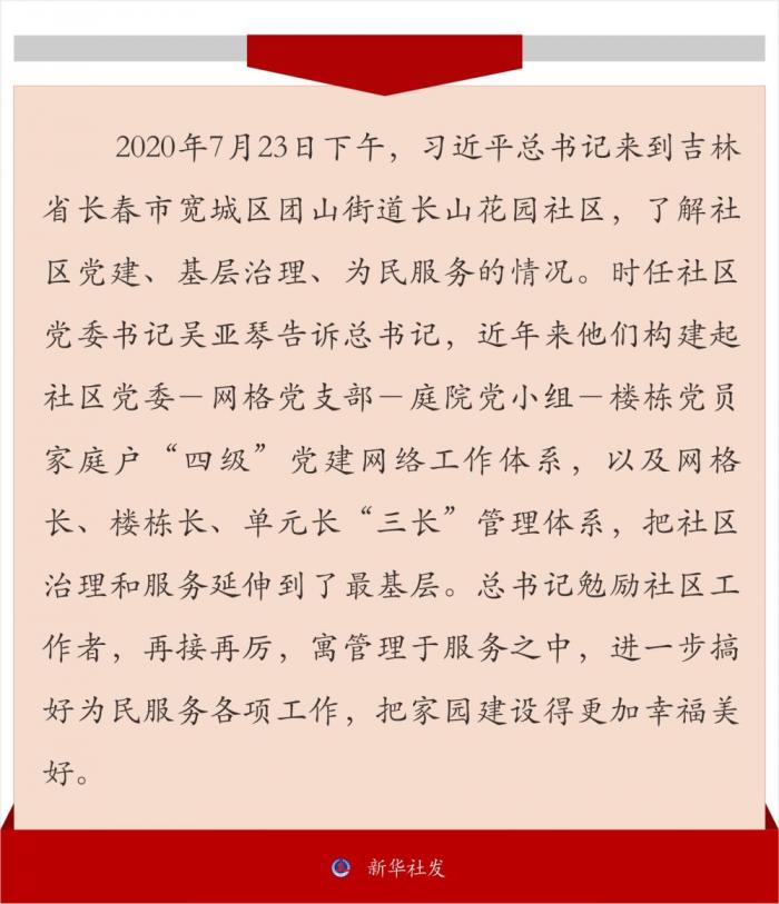 2020年7月23日下午,习近平总书记来到吉林省长春市宽城区团山街道长山花园社区,了解社区党建、基层治理、为民服务的情况。时任社区党委书记吴亚琴告诉总书记,近年来他们构建起社区党委-网格党支部-庭院党小组-楼栋党员家庭户“四级”党建网络工作体系,以及网格长、楼栋长、单元长“三长”管理体系,把社区治理和服务延伸到了最基层。总书记勉励社区工作者,再接再厉,寓管理于服务之中,进一步搞好为民服务各项工作,把家园建设得更加幸福美好。