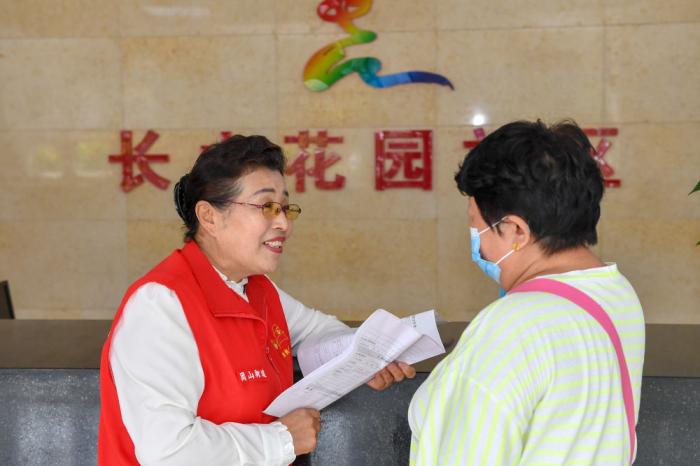 长山花园社区办事大厅里人流不断,吴亚琴迎来送往,走路带风。个不高,腰杆儿站得溜直,盘在脑后的头发一丝不苟,白衬衫外的红马甲,衬得她面颊红润。