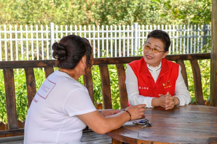 8月24日,吴亚琴(右)与团山街道长山花园社区的楼栋党支部书记李杰聊天。新华社记者 张楠 摄