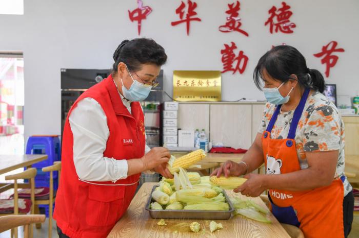 8月24日,在团山街道长山花园社区食堂,吴亚琴(左)与志愿者房桂香一同剥玉米。新华社记者 张楠 摄