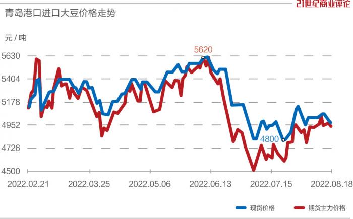 以大豆为例,同花顺的数据显示,2022年6月,进口大豆现货上海港每吨最高涨至5600元,比3月下旬的低点4130元涨了35%,到8月18日每吨价格回落至4980元。