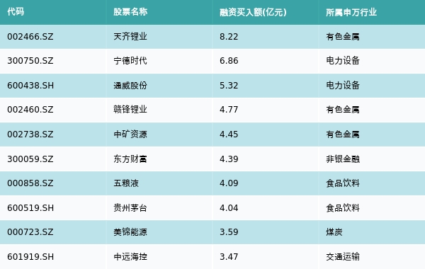 8月26日,两市共有2408只个股有融资资金买入,其中天齐锂业、宁德时代、通威股份排名前三,买入金额分别8.22亿元、6.86亿元、5.32亿元。融资买入额前10个股详情见下表: