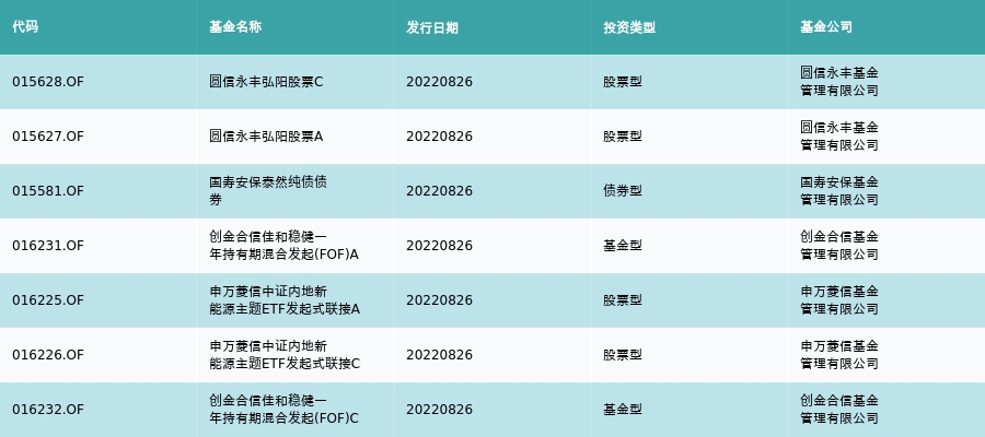 8月26日,有7只新基金发行,分别为:圆信永丰弘阳股票C、圆信永丰弘阳股票A、国寿安保泰然纯债债券、创金合信佳和稳健一年持有期混合发起(FOF)A、申万菱信中证内地新能源主题ETF发起式联接A、申万菱信中证内地新能源主题ETF发起式联接C、创金合信佳和稳健一年持有期混合发起(FOF)C,详情见下表: