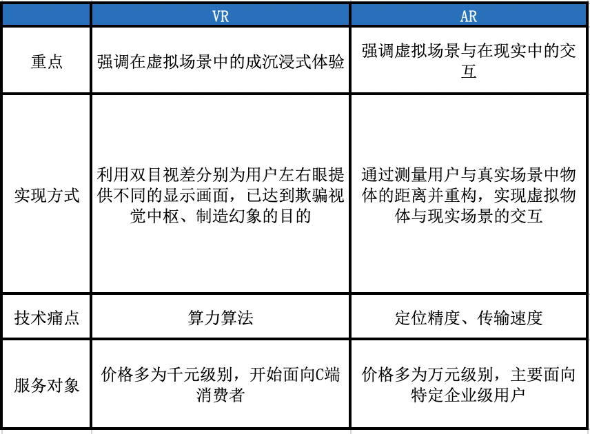现阶段,元宇宙入口终端的建设还处于起步中,许多人将现阶段水平的元宇宙比做移动互联网前的诺基亚时代。而在元宇宙的入口端建设中,VR和AR跑到了最前面。VR和AR二者都属于增强现实技术,但技术侧重点和技术路径上存在区别。从技术的发展程度上看,VR技术领先于AR技术。