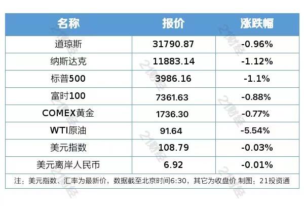 COMEX 12月黄金期货结算价收跌0.77%,报1736.30美元/盎司,连跌三日,创一个月新低。WTI 10月原油期货收跌5.37美元,跌幅5.54%,报91.64美元/桶。